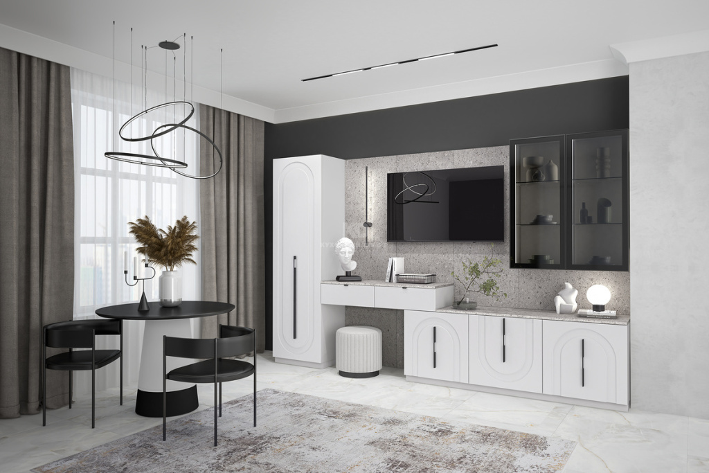 Элегантная геометрия арочной фрезеровки гостиной Арко, благородный кашемировый оттенок фасадов и графичные черные ручки разной длины и на разном уровне привносит в пространство динамику, не давая глазам заскучать. А на стене — декоративная панель с фактурой терраццо, которая подчеркивает строгость и самобытность композиции.