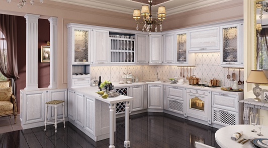 Белая деревянная кухня обладает следующими достоинствами: