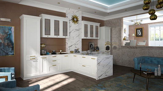 Конфигурация белого классического гарнитура может быть любой – прямой, угловой или П-образной. При линейном расположении кухонной мебели допускается два варианта: в один или два ряда. П-образные кухни более подходят для просторных комнат, в том числе для кухонь, совмещенных со столовой или гостиной. В качестве дополнения комплекта мебели могут выступать барная стойка, кухонный остров или полуостров.