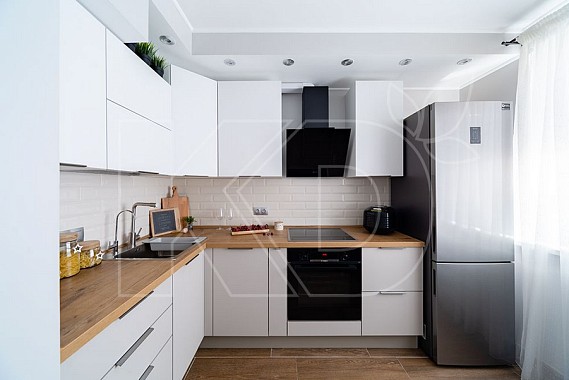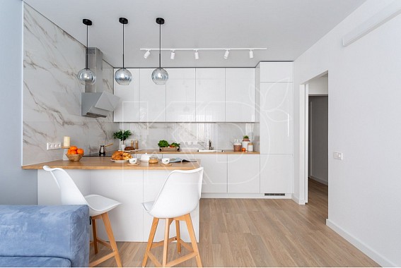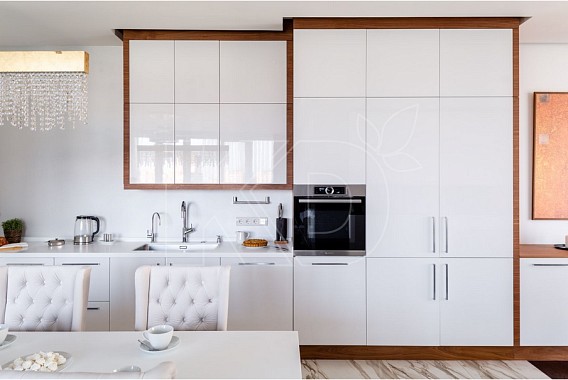 • Белые кухни делают помещение визуально более просторнорным, поскольку данный цвет обладает способностью зрительно расширять пространство. Особенно это актуально для небольших квартир. Эффект зрительного расширения пространства в белой кухне можно усилить при использовании глянцевых фасадов мебели. Хорошим выбором станут также современные белые гарнитуры, в которых сочетаются матовые и глянцевые поверхности. Например, нижние шкафы могут быть матовыми, а верхние ⎯ глянцевыми.