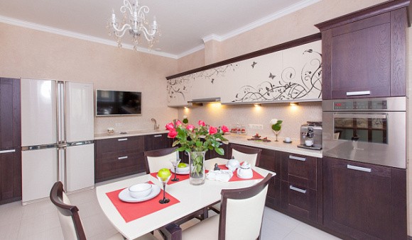 Декоративным элементом может стать даже кухонный фартук. Для этого его нужно оформить, используя кафельную кладку или стекло кофейного, черного, красного оттенка.