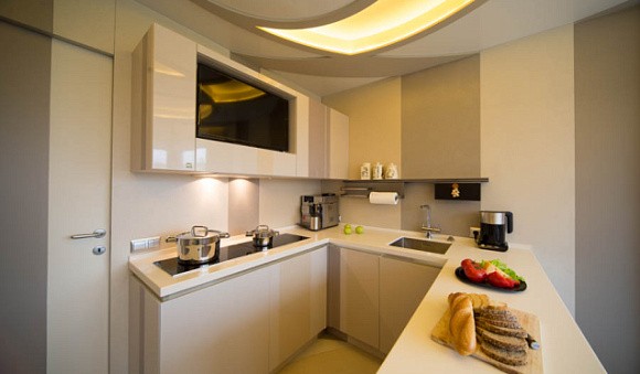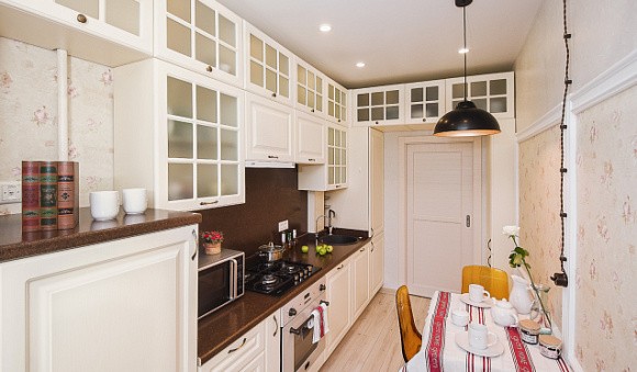 Форму бежевого кухонного гарнитура определяют размеры помещения и его архитектурные особенности. Так, для небольшого пространства подойдет линейная планировка. Модули такого комплекта займут место вдоль одной стены. Благодаря этому в комнате не возникнет ощущения перегруженности и затененности.