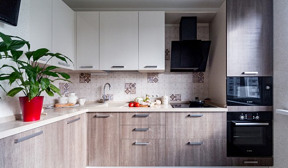 Угловые модели позволяют рационально использовать все возможности среднего по размерам пространства. Благодаря Г-образной расстановке шкафов в свободном углу устанавливают раковину или секцию для посуды.