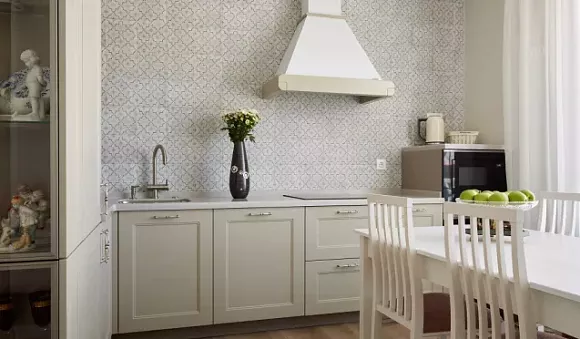 Чтобы бежевая кухня идеально встроилась в пространство, особое внимание следует уделить отделке стен. Дизайнеры рекомендуют выбирать оттенок обоев или краски, учитывая расположение окон. Если они расположены на южной стороне, и в комнату попадает много солнечного света, для оформления стен подойдут холодные серо-бежевые и серо-голубые тона. Для отделки помещения на северной части лучше выбрать более теплые оттенки – песочные, кремовые, оливковые или соломенные.