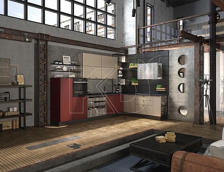 Огромной популярностью среди потребителей пользуются большие кухни в стиле лофт. Модели такого типа выполняют из натуральной древесины, качественного МДФ, шпона.