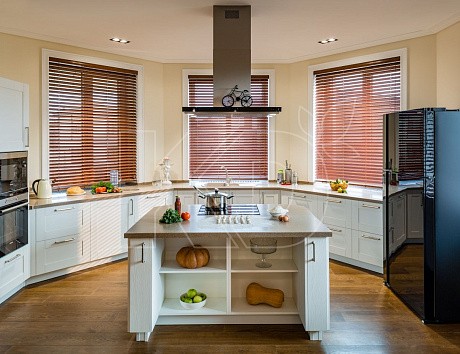 Довольно часто в продаже встречаются модели с фасадами с естественной фактурой дерева. Особенно эффектно смотрятся следующие древесные текстуры при оформлении больших кухонь в стиле лофт – состаренный дуб, потертое крашеное дерево и брашированная сосна.