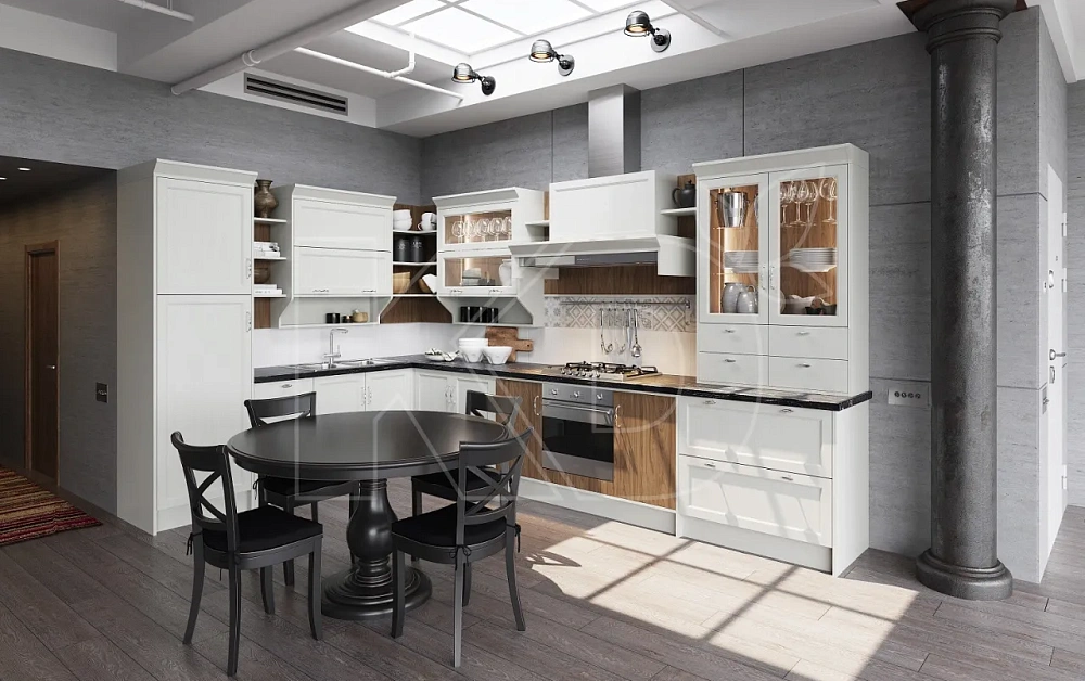 2. Размер. Мебель размещается в больших столовых и поэтому имеет большие размеры. Планировка - П-образная или квадратная, обычно с островом. Кухонные гарнитуры более сложные и часто имеют барную стойку или витражные шкафы. Дешевые модели обычно меньше по размеру и имеют линейную планировку.