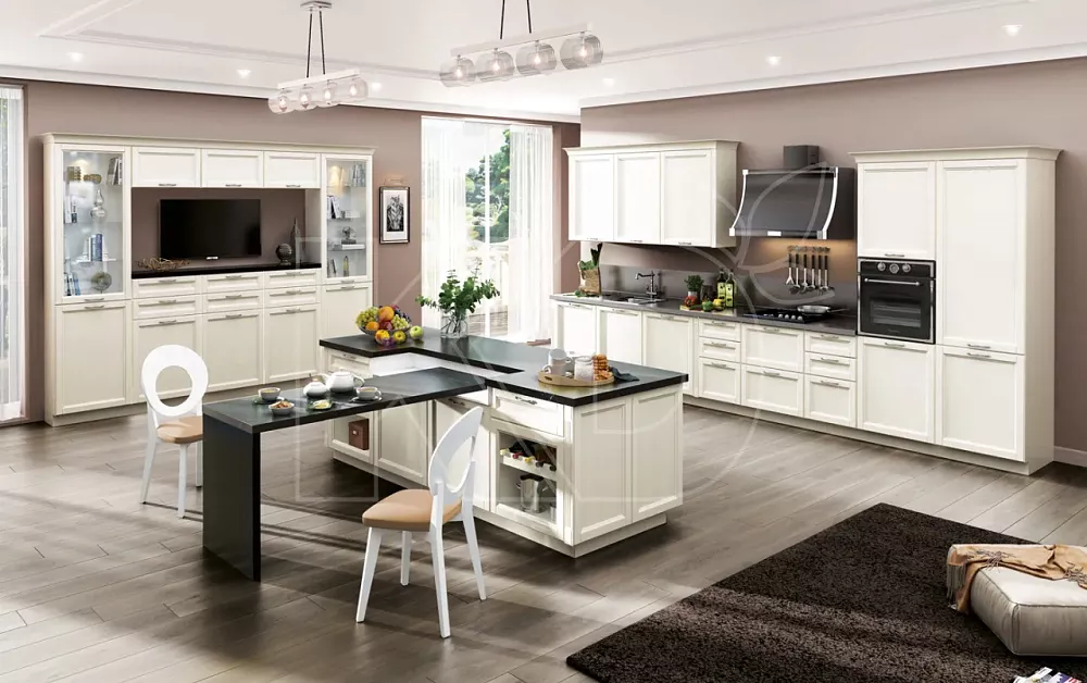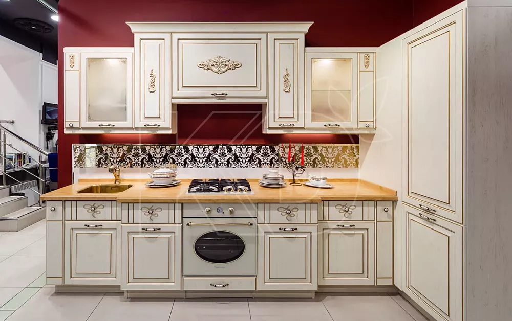 2. Размер. Мебель размещается в больших столовых и поэтому имеет большие размеры. Планировка - П-образная или квадратная, обычно с островом. Кухонные гарнитуры более сложные и часто имеют барную стойку или витражные шкафы. Дешевые модели обычно меньше по размеру и имеют линейную планировку.
