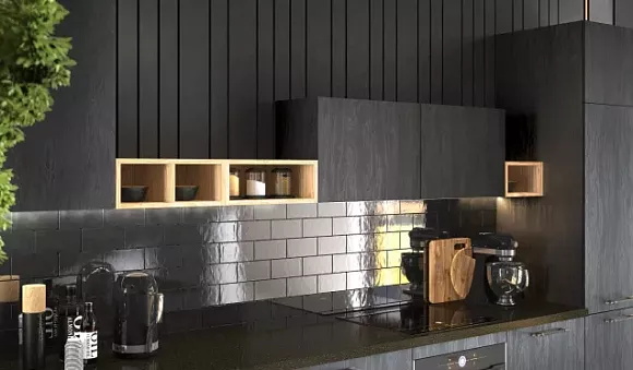 1. Прямой черный кухонный гарнитур отличается линейным дизайном с прямой столешницей и шкафами, расположенными вдоль одной стены. Прямая кухня идеально подходит для небольших помещений или квартир, поскольку максимально увеличивает доступное пространство, обеспечивая при этом достаточно много места для хранения и работы.