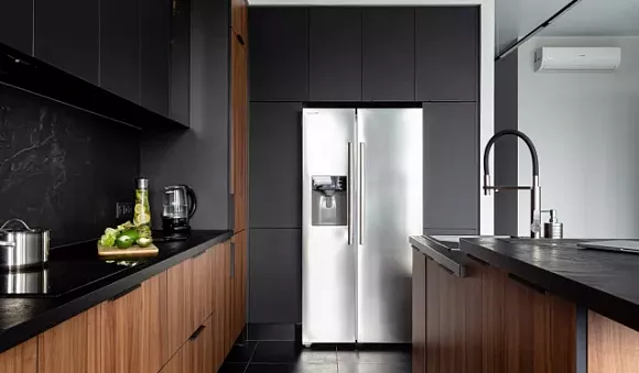 2. Черный цвет идеально подходит для модерна, поскольку он создает гладкий и утонченный образ, который можно сочетать со смелыми акцентами. Использование черных шкафов с фурнитурой из нержавеющей стали, черных столешниц и черного фартука, добавление яркого цвета с помощью смелых аксессуаров делает пространство эффектным и небанальным.