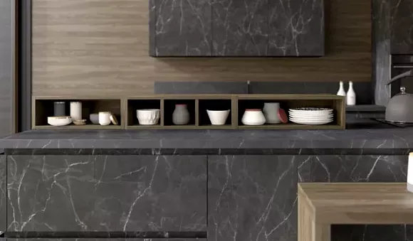 2. Серый — универсальный цвет, который хорошо сочетается с черным. Он может создать тонкий, утонченный вид при использовании в качестве столешницы или фартука. Серые шкафы в сочетании с черными столешницами или черной бытовой техникой будут отлично смотреться на современной кухне.