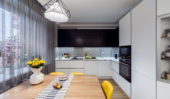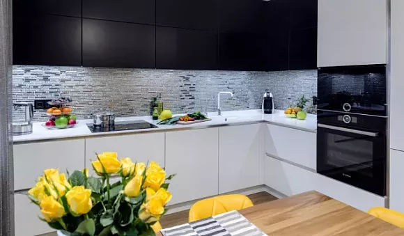 1. Белый — классический цвет кухонной мебели, который прекрасно сочетается с черным. Контраст между черным и белым создает потрясающий визуальный эффект, добавляющий кухне глубины и объема. Белый фартук или столешница на черной кухне могут стать смелым заявлением и создать современный, шикарный вид.