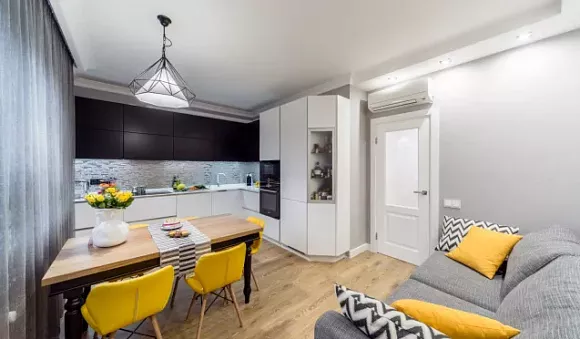 4. Г-образная кухня. В ней шкафы и столешницы располагаются вдоль двух смежных стен, образуя L-образную форму. Такое решение превосходно сочетается с помещениями открытой планировки, поскольку оно создает плавный переход между кухней и прилегающими помещениями.