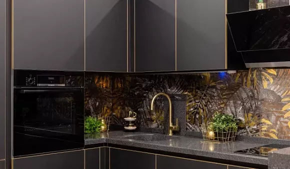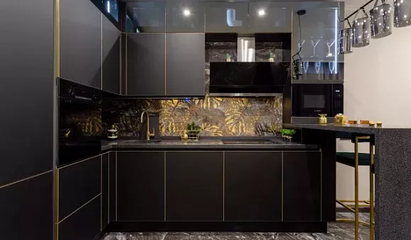 3. Стиль арт-деко — это смелые геометрические формы и роскошные материалы. Черный — популярный цвет в стиле арт-деко, поскольку он создает резкий контраст с блестящими металлами и отражающими поверхностями. Для воплощения стиля стоит рассмотреть возможность включения черных шкафов с золотыми или латунными акцентами, геометрической плитки для фартука и блестящих черных столешниц. Добавление зеркальных поверхностей или стеклянных подвесных светильников также может усилить ощущение арт-деко.