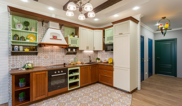 Деревенский стиль кантри отличается простотой, привлекательной палитрой оттенков. Чаще всего фасады таких комплектов выполняют в коричневых, фисташковых и бежевых тонах. Для декоративного оформления применяют растительные узоры, резьбу, рамки и решетки.