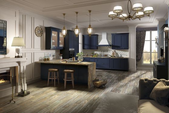 Классический кухонный гарнитур в таком помещении помогает расставить необходимые оттенки. Он может быть темно-зеленого цвета, оттенка марсала и даже темно-синего. Никогда не потеряет свою актуальность мебель, имеющая цвет необработанной древесины.