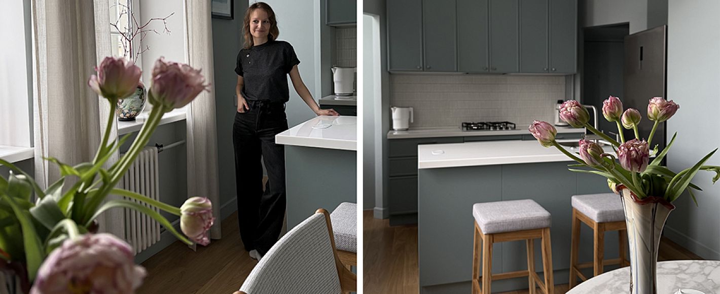 Хозяйка квартиры Галина — человек с тонким вкусом, коллекционер. Для неё и её супруга дом — это прежде всего место силы, где за одним столом должны собираться дети и внуки. Поэтому кухня не могла быть просто «зоной для готовки», она должна была стать центром квартиры, сохранив при этом эргономику профессионального кулинарного цеха, ведь здесь пекутся пироги с черёмухой, готовятся рулеты из мяса, запекается ароматная курица с невероятной корочкой.