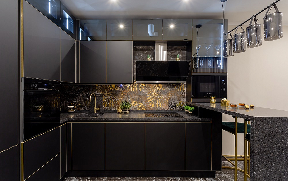 Чтобы П-образная кухня вписалась в интерьер максимально гармонично, расстояние между параллельными сторонами должно составлять, как минимум 120 см. В этом случае не возникнет сложностей при открывании духовки и дверец шкафов.