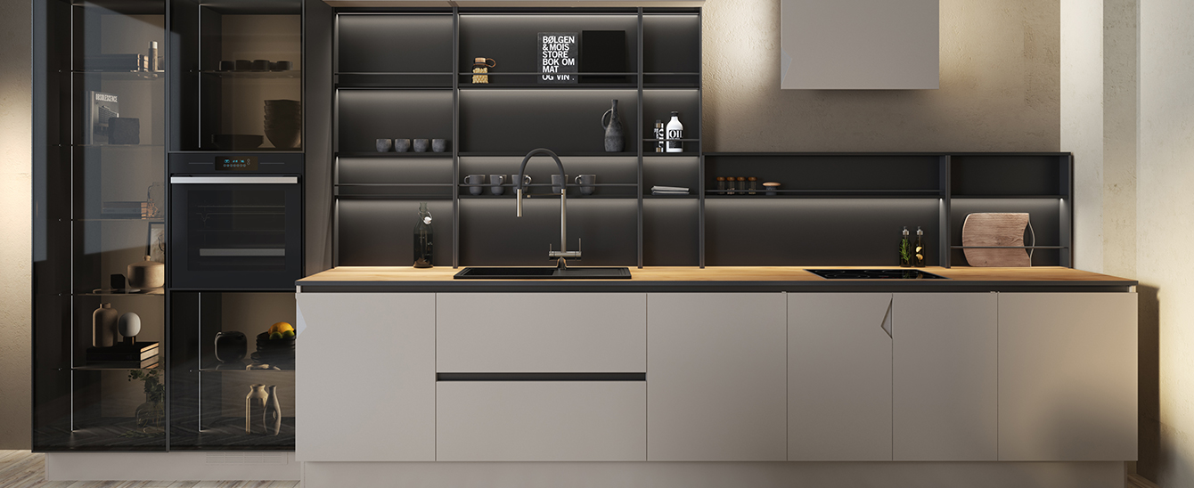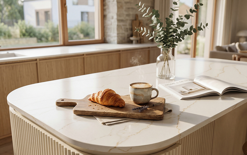 Кварцевый агломерат, искусственный камень, керамические столешницыи столешницы из пластика высокого давления (HPL-пластик) разработаны специально для активной жизни: они уверенно держат удар, не впитывают красящие жидкости (вино, соевый соус, томатная паста) и максимально неприхотливы в уходе. Такие поверхности легко переносят ежедневную готовку, детские гастрономические эксперименты и семейные ужины, оставаясь аккуратными и эстетичными. Это практичный выбор для тех клиентов, кто хочет, чтобы кухня выглядела безупречно не только в день установки, но и спустя долгие годы.