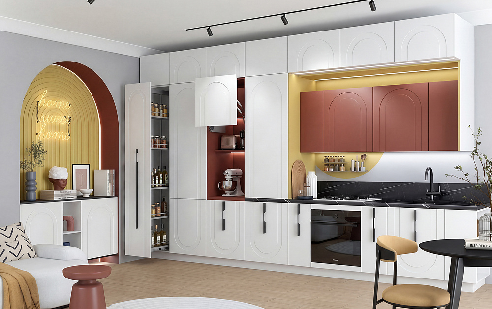 Точечные акценты — жёлтый, синий, кобальт, коралл — работают как вспышки энергии в интерьере: они оживляют пространство, добавляют настроения и мгновенно притягивают взгляд. Пара выразительных барных стульев, сочный текстиль или яркий фартук превращают спокойную базу в эффектный, запоминающийся образ — без визуального шума и перегруза. Это простой способ «включить характер» кухни и сделать её по-настоящему живой.