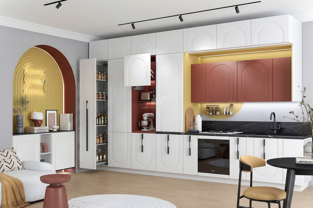 На первый план выходят удобство и грамотное зонирование. Кухня-гостиная становится доминантой всего дома. Дизайнеры в салонах бренда «Кухонный Двор» при разработке коллекций всегда учитывают эти запросы: создает современный, стильный и практичный кухонный гарнитур, который легко адаптируется под любой интерьер — от компактной студии до просторного пространства для большой и активной семьи.