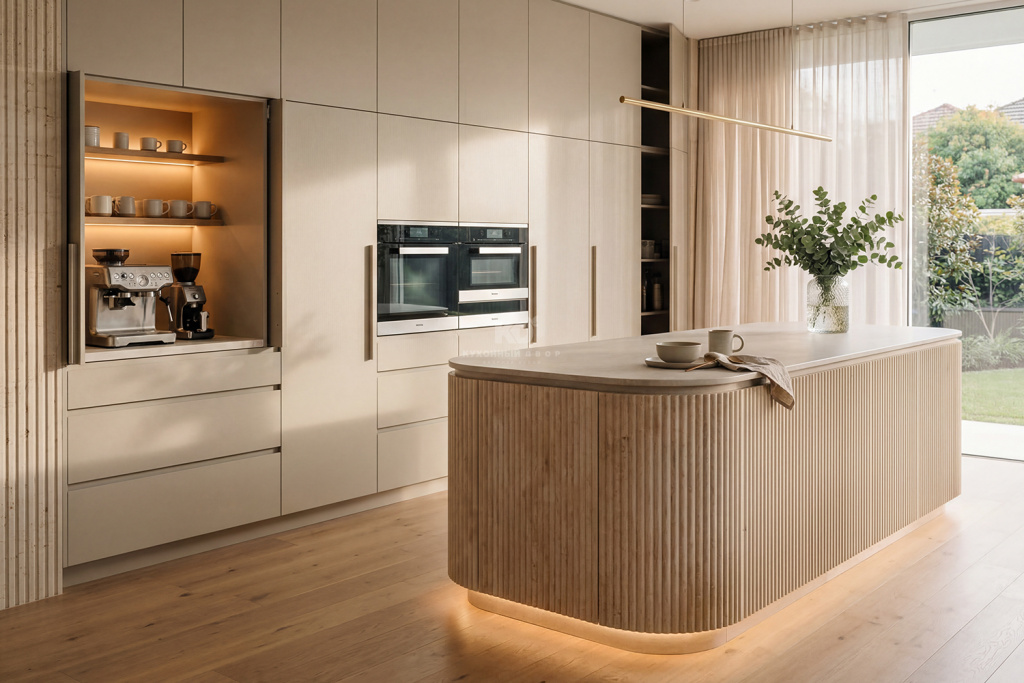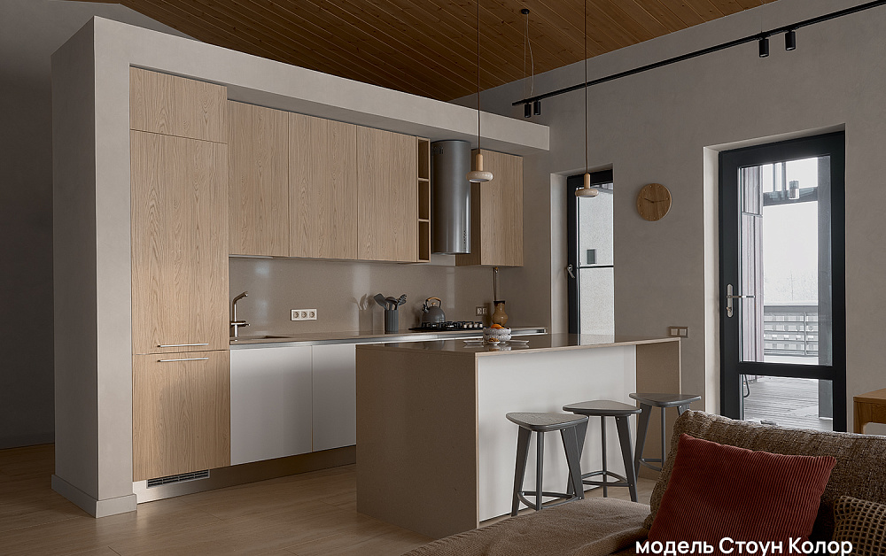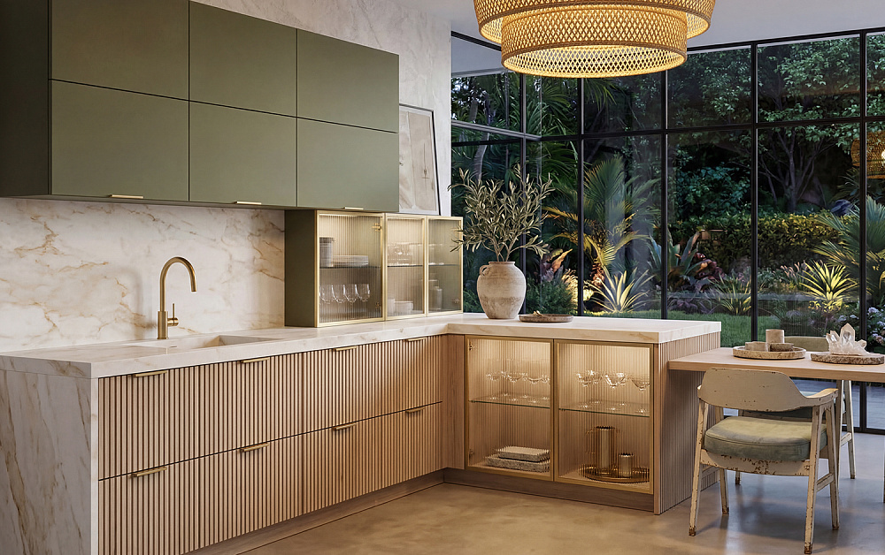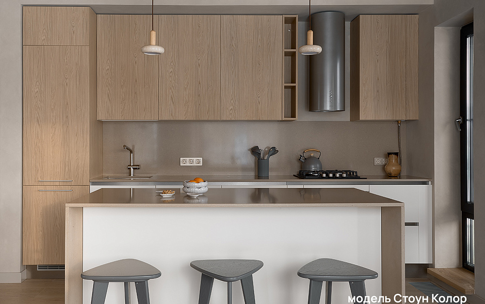 Рифлёные поверхности, бархатистое покрытие Мягкое прикосновение (Soft Touch) и тепло натурального дерева добавляют интерьеру глубины и тактильности. К таким материалам хочется прикасаться — они делают пространство живым, наполненным ощущениями и комфортом. Именно за счёт этих деталей кухня превращается из функциональной зоны в по-настоящему уютное место притяжения для всей семьи.