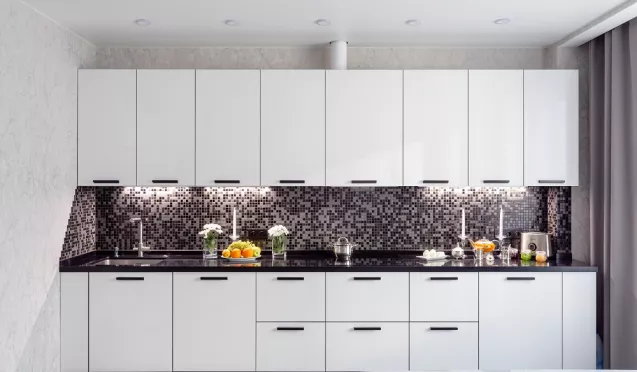 Пожалуй, это самое элегантное цветовое решение для глянцевой кухни. Чем меньше пространства, тем больше должно быть белой палитры, которая добавит простора и воздуха.