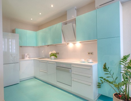 В разных оттенках выпускают синие кухни. При этом более темные подходят для просторных помещений, в которые попадает большое количество солнца. Для комнат со скудным освещением стоит выбрать модель со светло-синими шкафами.