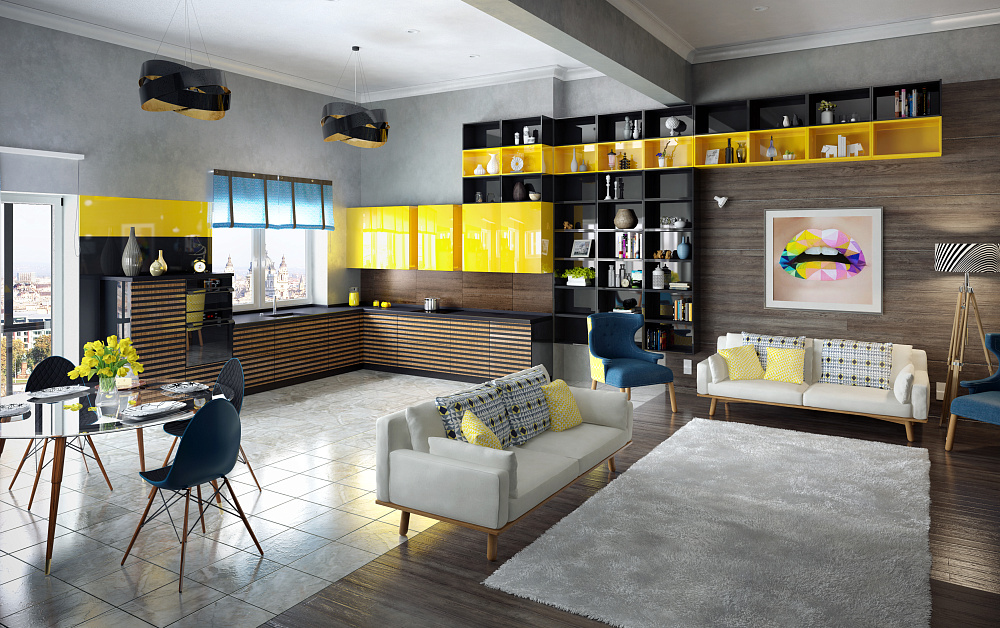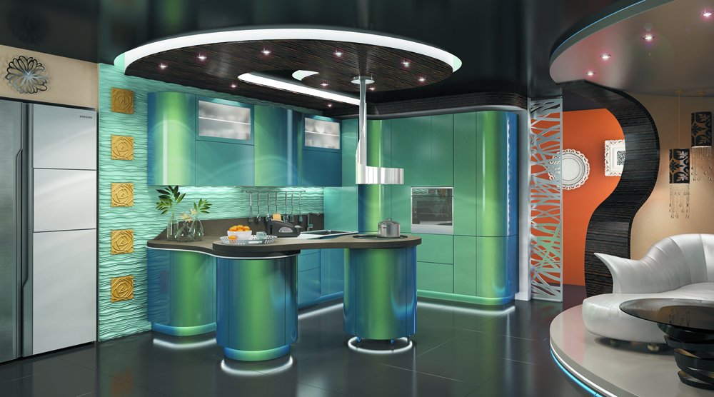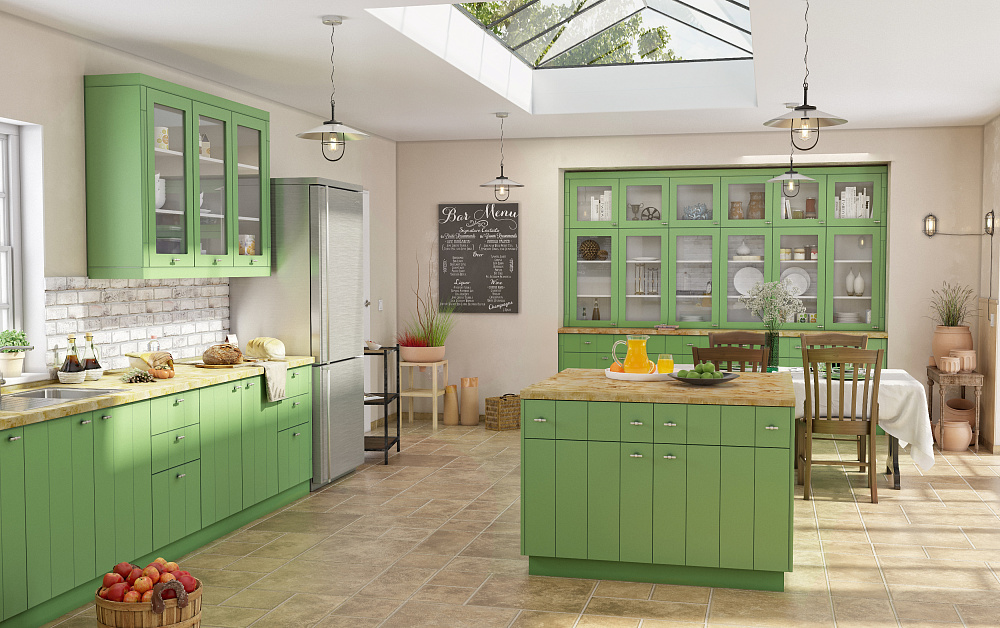 Выбирая оттенок для просторной кухни, учитывайте ее местоположение. Для комнаты на северной стороне подойдут ярко-желтые, оранжевые, бежевые комплекты. Такая мебель сгладит недостаток естественного освещения. Для помещений, расположенных в южной части, дизайнеры рекомендуют зеленые, синие, фиолетовые модели. Подобные расцветки визуально охлаждают помещение.