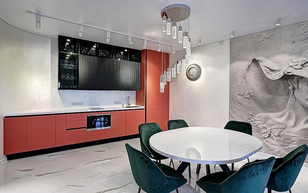 Если есть возможность, установите над столом для приема пищи навесные светильники. Благодаря этому приему обеденная зона будет смотреться особенно эффектно.