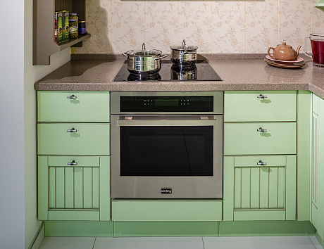 Это еще одна конфигурация, на которую стоит обратить внимание тем, кто решил купить узкую кухню в Москве. Если в конце пространства нет окна и батареи, то угловая расстановка – это отличное решение. В рамках нее гарнитур размещают в конце помещения вместе с мойкой и холодильником. Это позволяет освободить максимум пространства в начале комнаты и в центре. На свободной территории можно поставить обеденный стол, диван, шкаф-пенал или другую мебель.