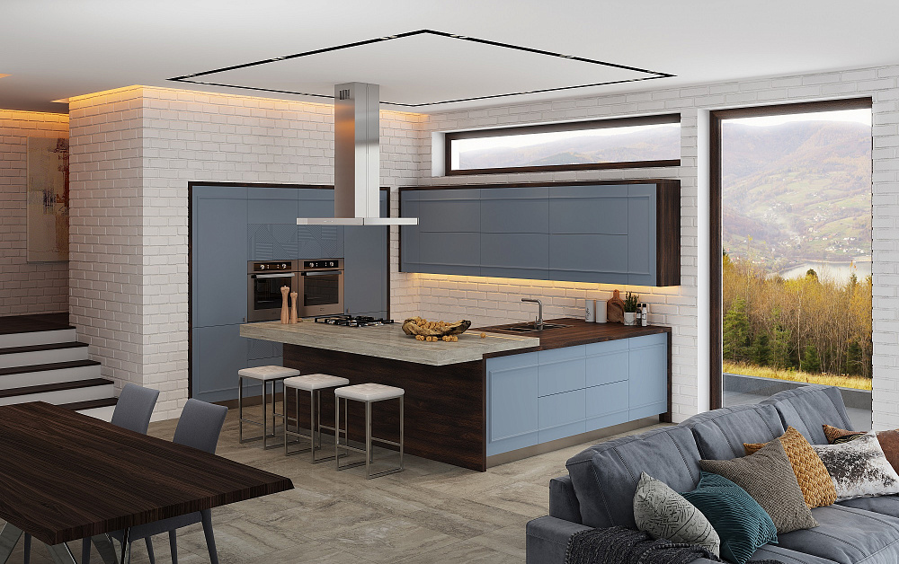 В больших помещениях кухня и гостиная часто оказываются совмещенными. Визуально отделить одну зону от другой можно с помощью островной конструкции, барной стойки или стеллажа. Зонирование с помощью кухни на заказ от производителя технически выполнить гораздо проще. Дело в том, что комплект будет изготовлен с учетом архитектуры пространства.