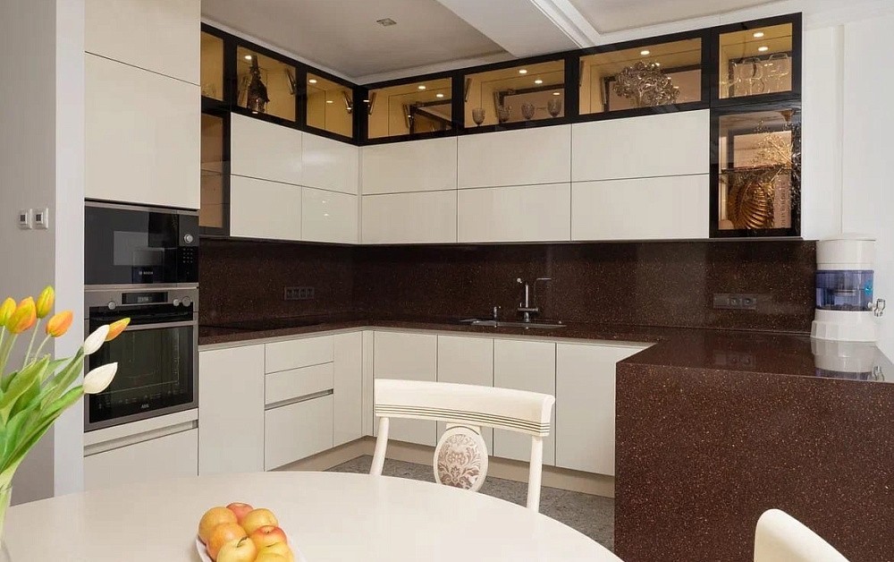 Угловая кухня – идеальный вариант для среднего по размерам помещения. При такой планировке шкафы устанавливаются вдоль двух смежных стен. В образовавшийся на их стыке угол устанавливают дополнительный шкаф, полку или раковину.