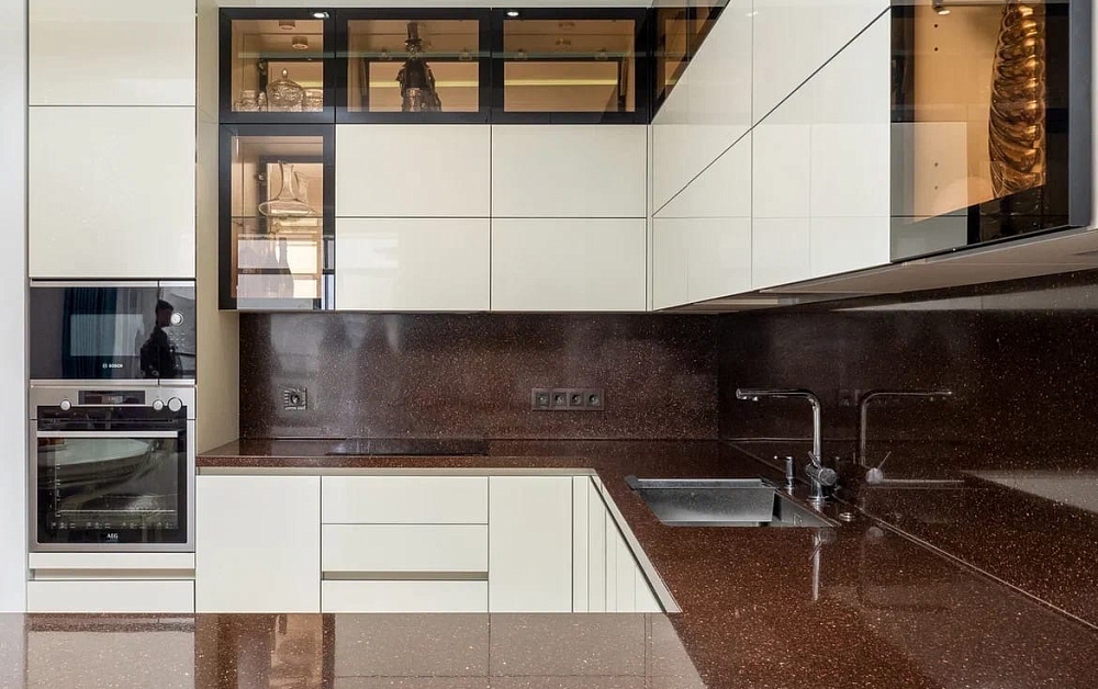 Для комнат с внушительной площадью можно подобрать темную или, наоборот, яркую кухню. В помещениях на южной стороне допускается установка графитовых, шоколадных, вишневых и темно-зеленых комплектов. Более смелый вариант – модель черного цвета.