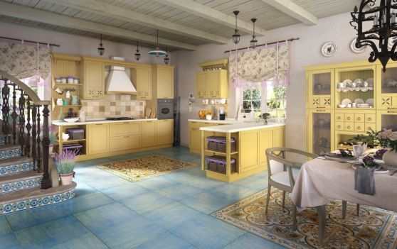Для больших комнат подходят П-образные, островные и двухрядные версии. Расцветка и декоративная отделка моделей может быть любой, так как большая площадь позволяет дать волю фантазии.
