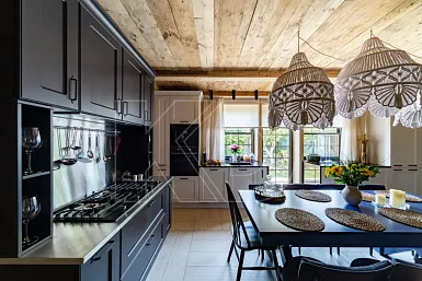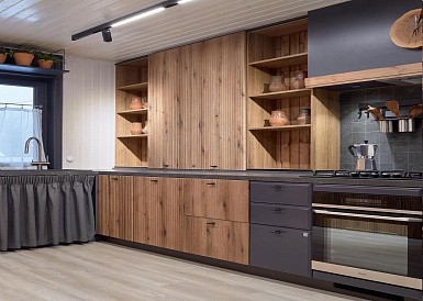 Также дуб применяют для создания комплектов в духе кантри. Природная палитра оттенков передает теплоту сельского стиля, его особое очарование и уют. Фасады таких моделей декорируют решетками и рамками, что создает завершенность и гармоничность дизайна.