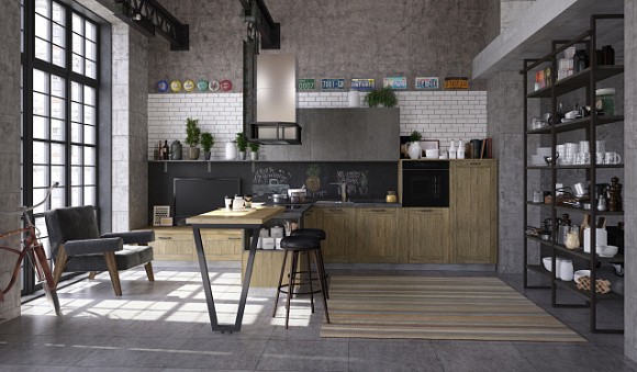 Кухонный гарнитур коричневого цвета идеально вписывается в стиль лофт. Для придания дизайну характерной своеобразности используется красно-коричневый кирпич или бетон. Мебель в стиле лофт специально должна быть грубоватой, но при этом эргономичной и функциональной. Основной задачей в процессе проектирования является сохранение эффекта промышленного помещения.