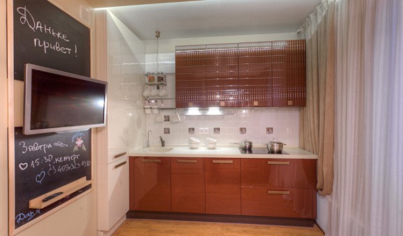 Дополнять коричневый кухонный гарнитур следует шоколадно-бежевым глянцем на фартуке, покрытиях фасада и стеновой облицовке. Благодаря этому помещение станет особенно стильным. Особого внимания заслуживают мебельные торцы и контуры фасада. Для маленьких помещений выбирают прозрачные стулья или изделия, выполненные в светло-бежевых тонах.