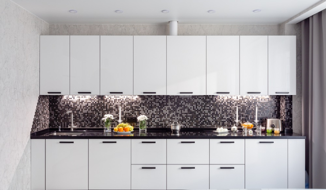 Часто для меблировки кухни доступна только одна стена, поэтому хозяйки выбирают линейную кухню. Таким образом, высокие шкафы, тумбы со столешницей, варочной панелью и раковиной, а также навесные шкафы объединены в одну линию для компактного и функционального размещения.
