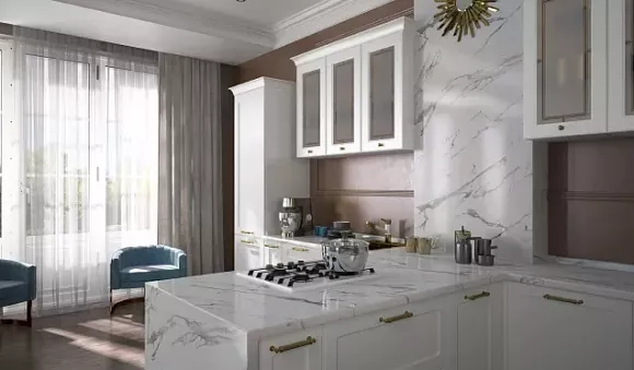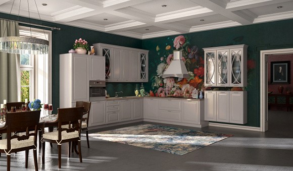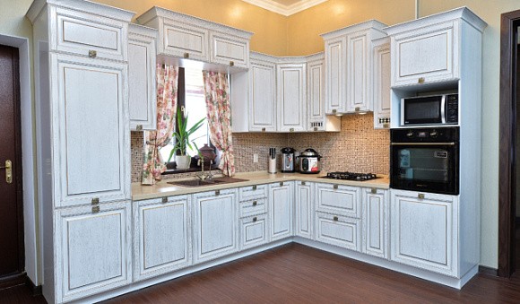 Комплекты, выполненные по канонам классики, декорируют патиной, позолоченными элементами, резными узорами и лепниной.