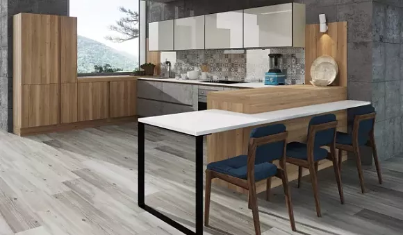 Чтобы кухня серого цвета выглядела максимально эффектно, следует позаботиться и о напольном покрытии. Оттенок необработанной древесины и дымчатый – одно из самых удачных сочетаний, которое часто используется в дизайне интерьера. Также можно использовать бежевые, песочные, светло-коричневые расцветки для отделки пола. И, конечно, напольное покрытие должно быть качественным – устойчивым к перепаду температур, воздействию влаги и бытовой химии. Этим требованиям отвечают керамическая плитка, керамогранит, линолеум высокого класса.