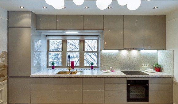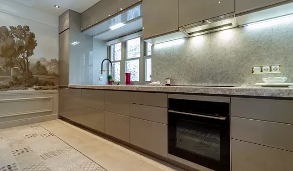Минусом глянца является быстрое загрязнение. На зеркальных фасадах видны отпечатки пальцев, пыль, разводы и подтеки. Слегка нивелировать этот недостаток позволяют более светло-серые оттенки.