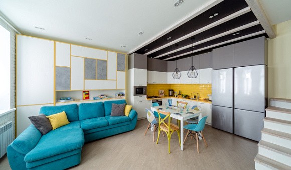 Серо-голубая комбинация является довольно интересным вариантом, приспособить который можно в любое пространство. Например, для большой площади можно выбрать сочетание графитового и синего. Для маленького помещения подойдет более светлая комбинация. Интересный вариант – дуэт дымчатого и голубого, разбавленный белым.