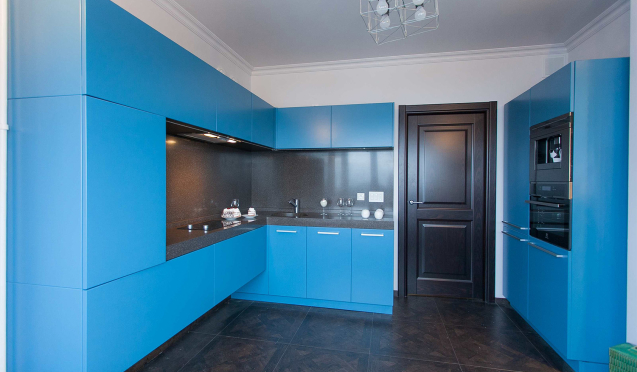 • Голубая кухня дарит покой. Этот цвет помогает расширить помещение.