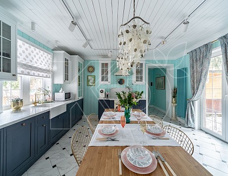 Чтобы синяя кухня в интерьере смотрелась максимально гармонично, необходимо тщательно продумать убранство помещения. Именно от этого зависит, насколько комфортно будет находиться в нем в дальнейшем. Так, для отделки стен в небольшом пространстве лучше выбрать светлую гамму в кремовых, бежевых или белых тонах. Наиболее подходящее решение – однотонные обои или плитка. Также приветствуются ненавязчивые абстрактные рисунки в виде едва заметных разводов или пятен. В просторной комнате больше возможностей для экспериментов. Поэтому синюю кухню в интерьере с большой площадью можно обыграть обоями с выраженными геометрическими узорами, изображениями флоры и фауны.