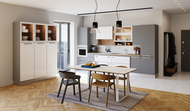 Можно купить готовый гарнитур или выбрать кухни на заказ от производителя, подобрав оптимальное наполнение, оттенок и тип фасадов.