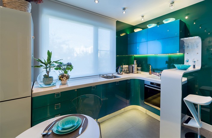 В то же время противоположный угол кухни остается свободным – именно в нем оборудуют обеденную зону. Здесь устанавливают стол со стульями или небольшой софой, подвешивают на стену телевизор.