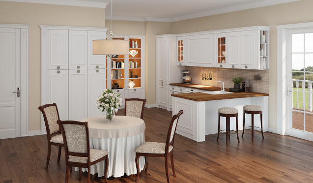 • Более авангардные решения, в которых на фасадах мебельного гарнитура применяются вставки из натурального дерева или белые блоки – смотрятся более свежо в любой обстановке вне зависимости от степени освещенности. Они понравятся почитателям стилей прованс, эклектика и модерн.