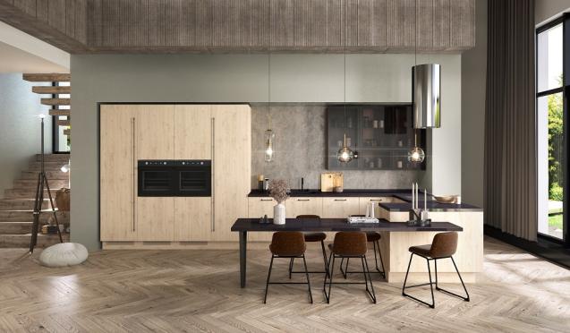 1. Самыми эффектными кухнями на 2023 год считаются модели с контрастным сочетанием блоков, выполненные из экологичных материалов в комплектации фасадов из МДФ и экомембраны со стилизацией под светлое и темное дерево.