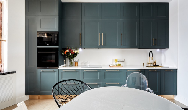 В небольшие пространства идеально вписываются прямые кухни. В этом случае столешница находится между варочной плитой и раковиной. Такое расположение в совокупности с правильной высотой столешницы позволяет с комфортом готовить одному человеку.